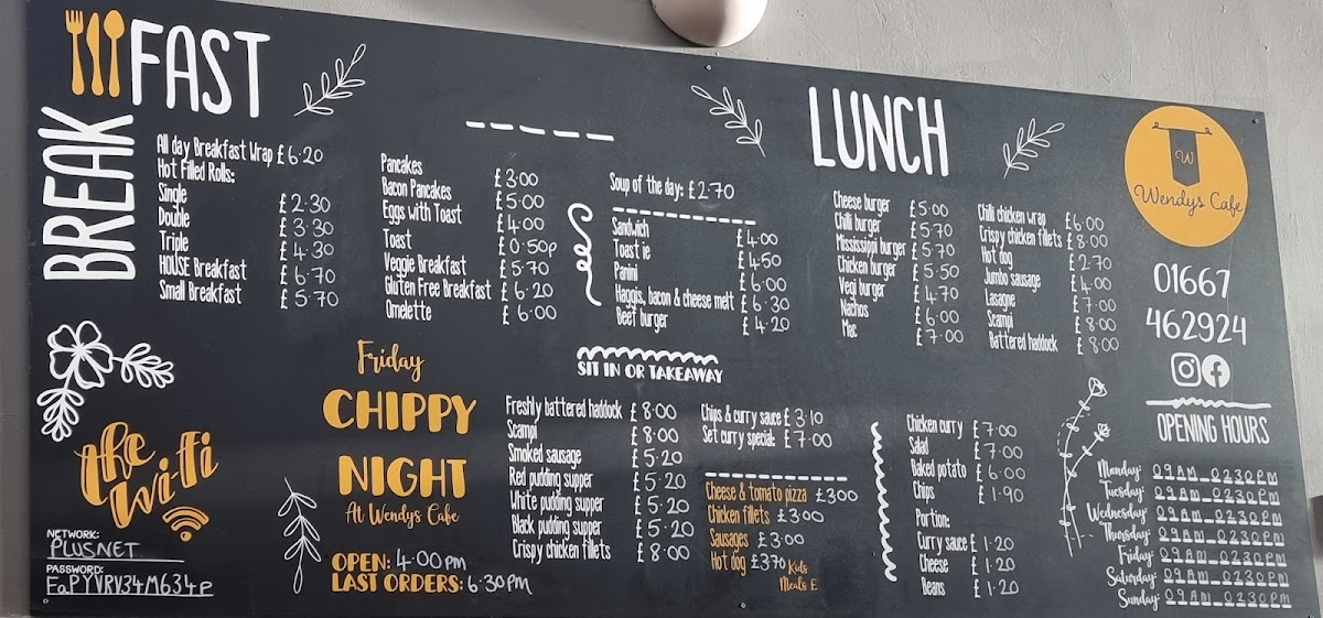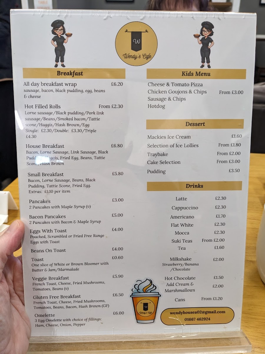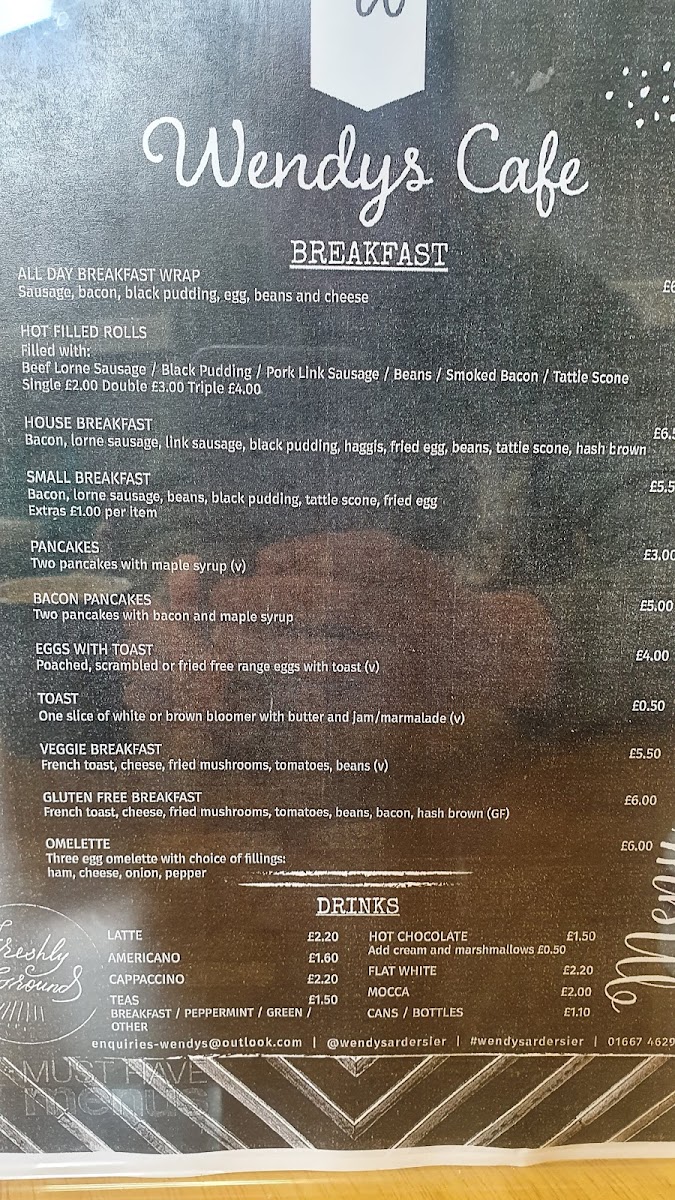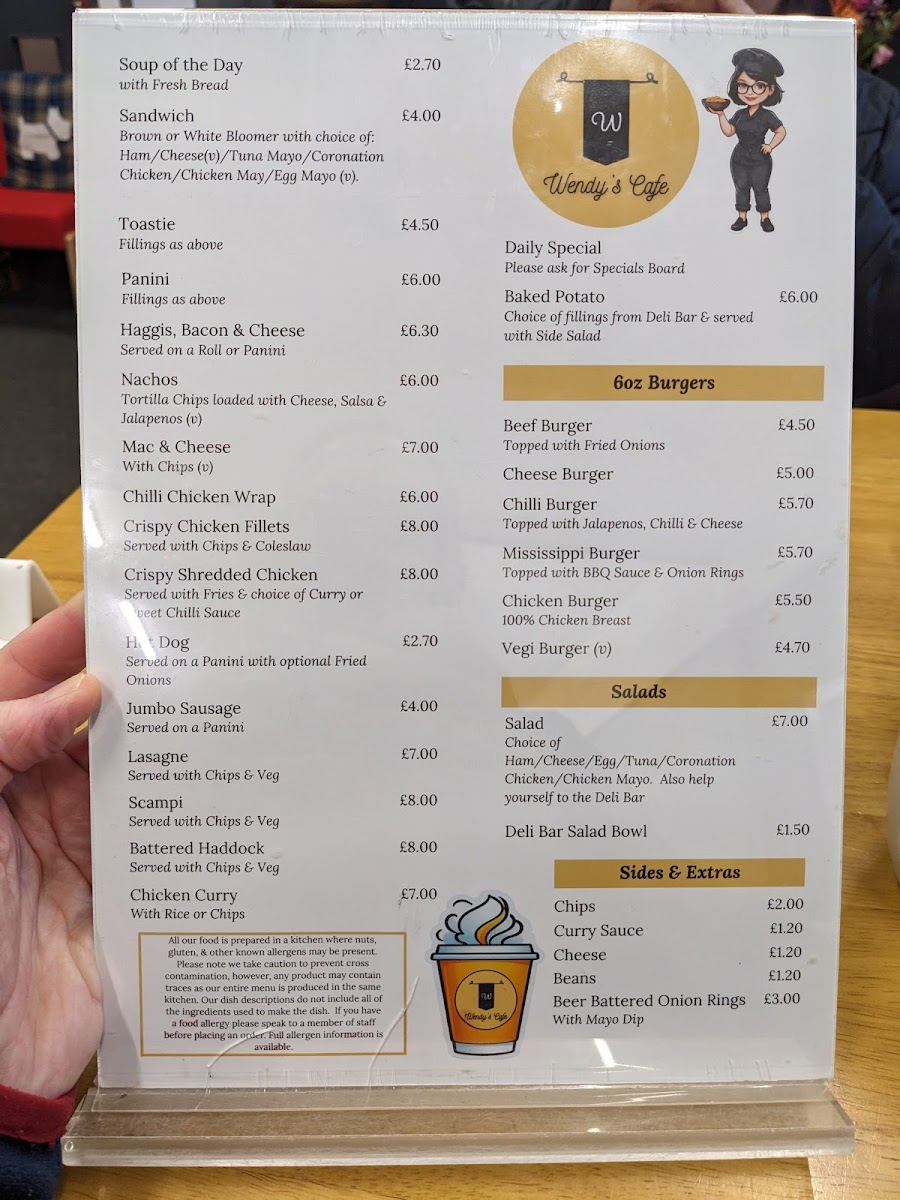 Other Food Items: Beyond breakfast, the menu includes various main meals and light bites such as beef, cheese, chilli, Mississippi, chicken, and vegetarian burgers; soup of the day; paninis including a haggis, bacon & cheese melt; mac and cheese; freshly battered haddock; chicken curry; smoked sausage; red pudding supper; cheese & tomato pizza; salad; and baked potatoes. These options accommodate a range of tastes and meal occasions from casual light meals to more substantial dishes.
